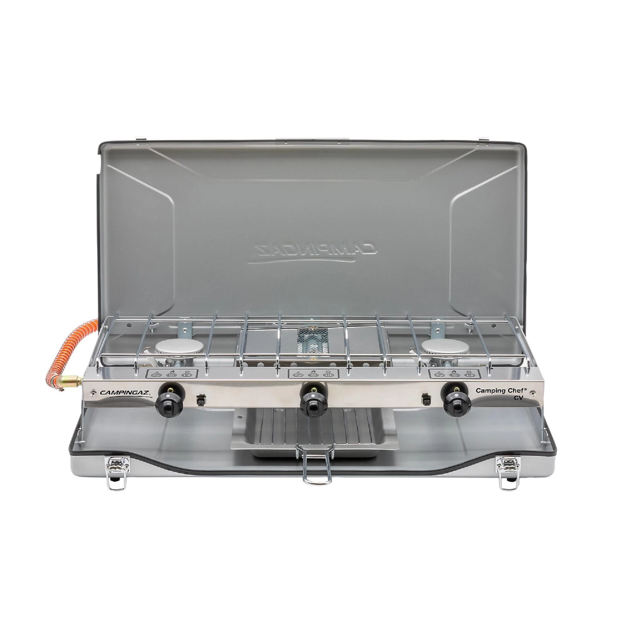 An essential for any family camping trip, this multi-functional Camping Chef Folding CV has 2 powerful and efficient burners plus an additional downward grill.The Camping Chef Folding CV operates off Campingaz CV 470 Plus cartridges for