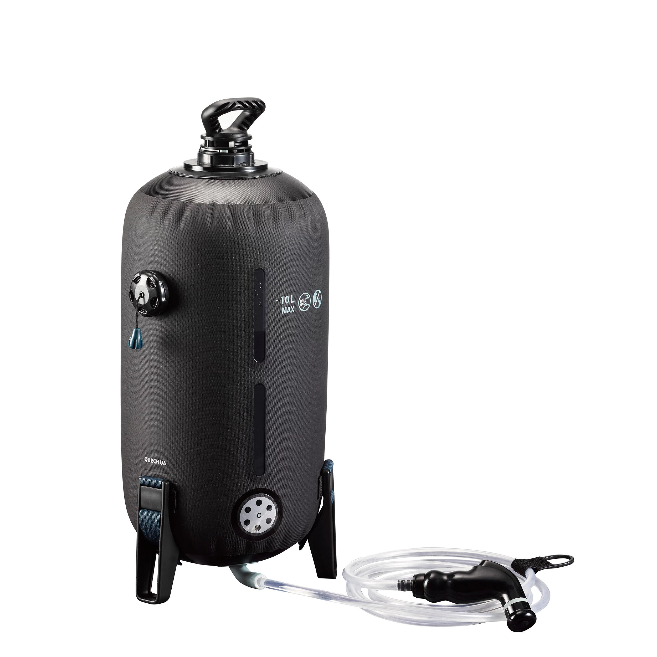 Our camping designers have created this 10 litre pressure-balanced solar shower so you can have a comfortable shower outside and wash your belongings.Our motivation? We want to provide you with a solar shower solution that you do not have to hang up! The water will be pressurised even if your shower is on the ground thanks to the pumping system!