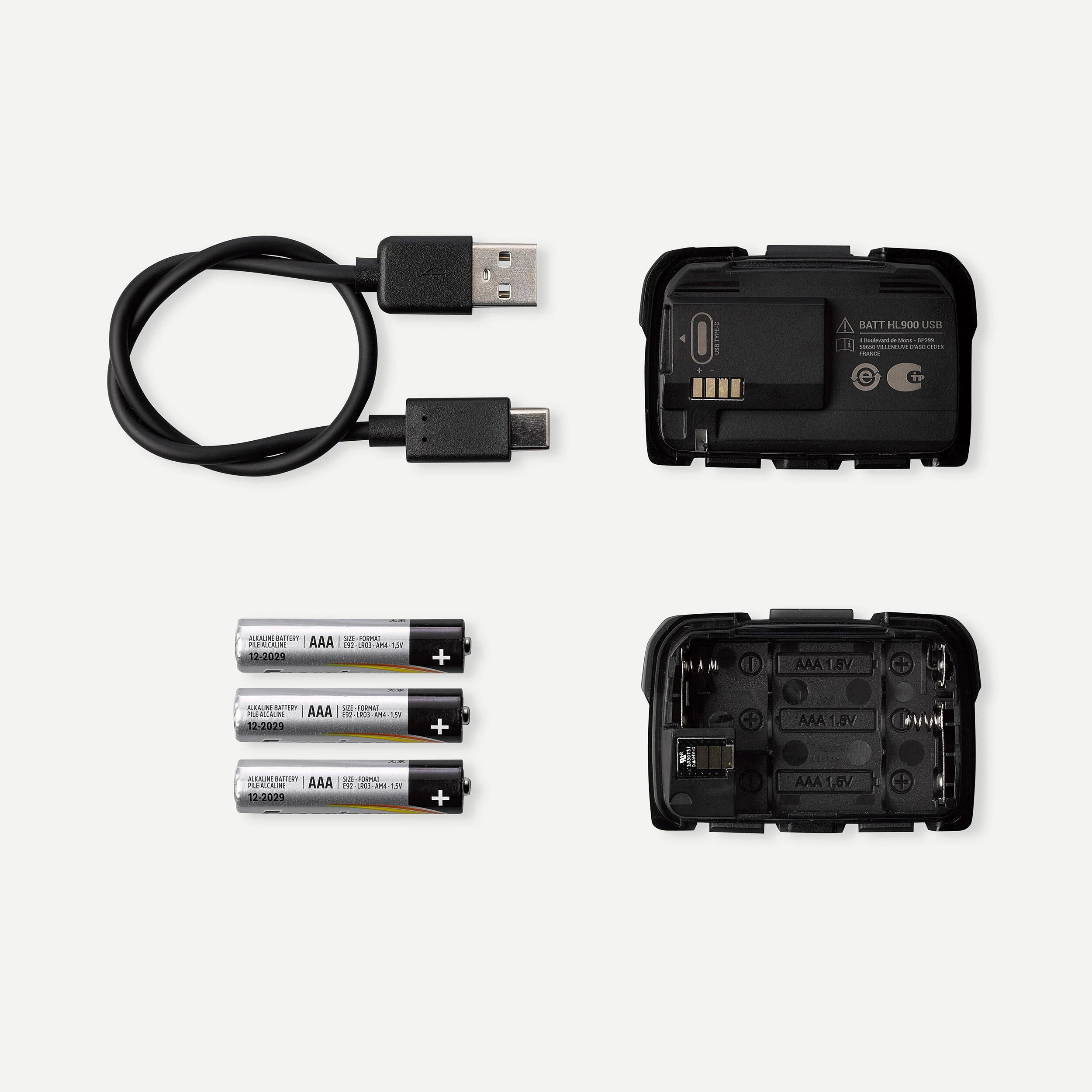 The HL900 USB headlamp comes with an adapter for 3 AAA batteries (not included). It enables you to use disposable batteries if you do not have a USB charger to hand or if you prefer disposable batteries to a rechargeable battery.
