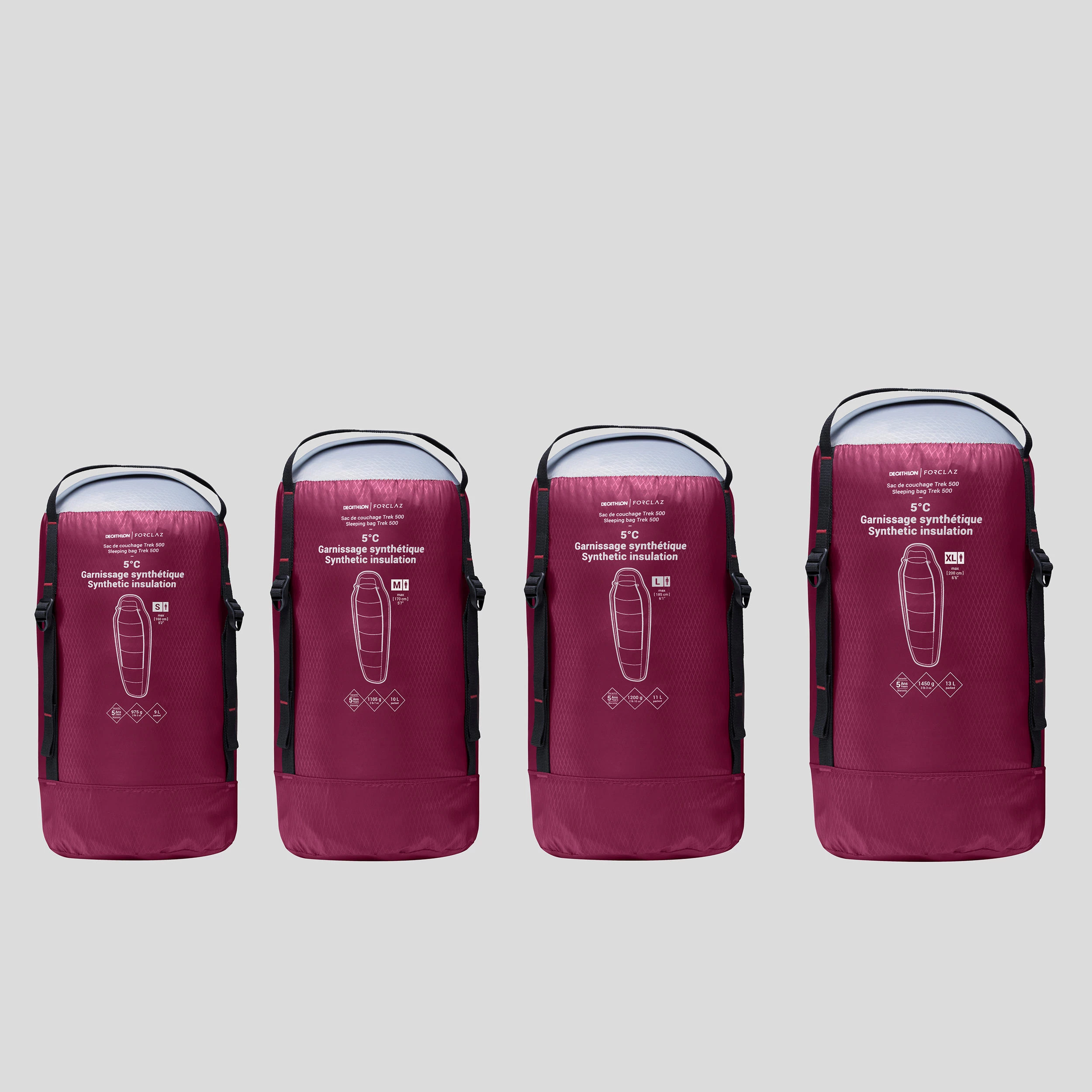 Size L: 1200 g, user from 1.70m to 1.84m tall. Bag dim.: L 40 cm Ø 19 cm. Volume 11.3 L. Size XL: 1290 g, user from 1.85m to 2m tall. Bag dim.: L 40 cm Ø 20 cm. Volume 12.6 L.